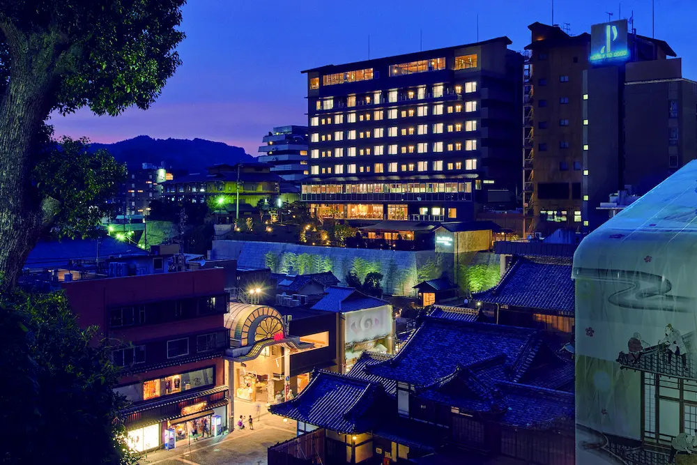道後温泉本館のすぐそばに佇む「古湧園 遥」。街と宿がつながる旅の拠点。
